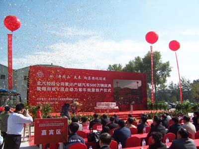 10月12日,“北汽控股公司累計(jì)產(chǎn)銷500萬(wàn)輛汽車慶典暨福田歐V混合動(dòng)力客車批量投產(chǎn)儀式”在福田汽車工程研究院節(jié)能減排重點(diǎn)試驗(yàn)室南門廣場(chǎng)隆重舉行。它不僅標(biāo)志著北京汽車工業(yè)系統(tǒng)累計(jì)生產(chǎn)汽車已經(jīng)突破500萬(wàn)輛,同時(shí)也標(biāo)志著福田汽車響應(yīng)建設(shè)節(jié)約型社會(huì)號(hào)召的典型產(chǎn)品――歐V混合動(dòng)力客車正式批量投產(chǎn)。這個(gè)日子注定要被載入北汽集團(tuán)的史冊(cè),也必將會(huì)被中國(guó)汽車工業(yè)的發(fā)展歷史所牢記。本次活動(dòng)在黨的十七大召開(kāi)前夕舉行,不僅展示了北京工業(yè)發(fā)展的成就,同時(shí)也是向黨的十七大最好的獻(xiàn)禮。
