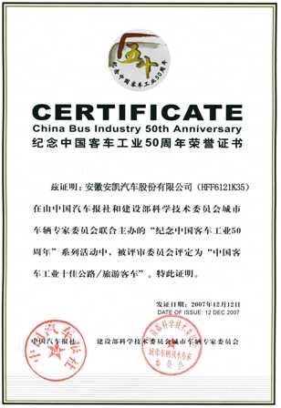 由中國(guó)汽車報(bào)社和建設(shè)部科技委城市車輛專家委員會(huì)聯(lián)合舉辦的“紀(jì)念中國(guó)客車工業(yè)50周年頒獎(jiǎng)典禮暨中國(guó)客車工業(yè)50周年紀(jì)念大會(huì)”,12月12日在北京世紀(jì)金源大飯店隆重舉行。安徽安凱汽車股份有限公司在這次紀(jì)念中國(guó)客車工業(yè)50周年的評(píng)選活動(dòng)中,榮膺三項(xiàng)大獎(jiǎng),分別是:HFF6113GK50榮獲“中國(guó)客車工業(yè)十佳城市客車”榮譽(yù)稱號(hào);HFF6121K35榮獲“中國(guó)客車工業(yè)十佳公路客車”榮譽(yù)稱號(hào);安凱牌榮獲“中國(guó)客車工業(yè)十佳品牌”榮譽(yù)稱號(hào)。安凱客車獲得獎(jiǎng)項(xiàng)的數(shù)量在國(guó)內(nèi)客車企業(yè)中位于前列。