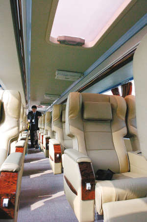 這種豪華高檔商務(wù)車屬于德國(guó)尼奧普蘭6127S型,“塊頭”比現(xiàn)有的快客車稍微高大,分兩層,下層有8個(gè)位置,上層有29個(gè)位置,乘坐空間寬松。車上有5部車載電視機(jī),衛(wèi)生間是坐式的,內(nèi)部設(shè)施可與飛機(jī)媲美。這種客車前后座位之間的距離有108厘米,同排兩個(gè)座位的寬度有135厘米,比一般快客車均增加了近20厘米。另外,這種客車的每個(gè)座位都設(shè)置了腳托,每張座椅都設(shè)置了可以調(diào)節(jié)的小靠枕。身高1.75米以上或者肥胖的乘客乘坐,都不會(huì)覺得空間狹小。