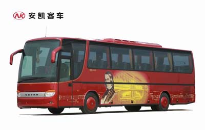賽特拉*尊榮400(HFF6121K35)是安徽安凱汽車股份有限公司與德國奔馳集團EVOBUS公司10余年合作的代表作品。其外觀典雅時尚,秉承人文理念的流線型設計引人注目,尤為稱贊的是客車前圍的造型設計,運用柵欄式進風口,有效降低風阻系數,符合人體工程學原理的高靠背豪華商務座椅,冰箱、彩電、VCD、衛(wèi)生間等一應俱全,加上過濾清新裝置的沐浴式空調,保證了車內冷、暖溫度分布均勻,車內空氣新鮮持久。