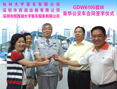 6月3日,深圳市西湖運輸有限公司與桂林大宇簽訂批量采購協(xié)議,47輛達到歐III排放標準的桂林大宇“城市風景”GDW6105HG豪華公交車將于本月底駛上深圳街頭。這是桂林大宇第二次進入深圳公交市場。