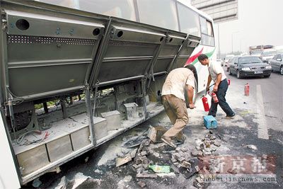 白色的大客車停在路邊,車旁兩側(cè)地上,幾十個(gè)電池箱還在冒煙,熱得燙手。昨日上午,朝陽區(qū)東五環(huán)東壩出口南側(cè),一輛由北向南行駛的大金龍客車自燃,事故未造成人員傷亡,受此影響,該路段短時(shí)間交通擁堵。該車上人員稱,該車是試驗(yàn)車,正準(zhǔn)備送去檢驗(yàn)。
