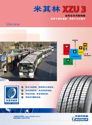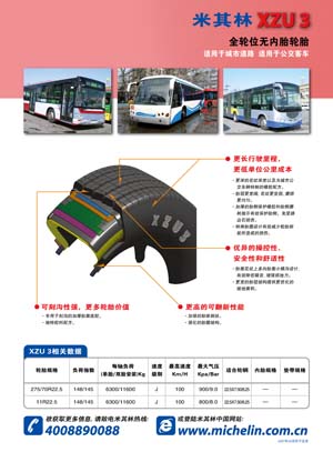 從90年代開始,米其林不斷研發(fā)并開始生產(chǎn)城市道路專用輪胎,以滿足城市車輛的使用要求。米其林集團(tuán)向北京公交提供的275/70R22.5XZU3輪胎是其全球最新研發(fā)的公交專用產(chǎn)品,同時(shí)也是其首先在中國生產(chǎn)的一款輪胎。這款輪胎花紋更深,使輪胎壽命最大化;胎冠接地面積更寬闊,磨損更均勻;新的花紋設(shè)計(jì)令花紋塊更堅(jiān)固,接地面磨損更均勻,從而保證輪胎有更長的里程壽命,降低客戶的每公里單位成本;特別設(shè)計(jì)的輪胎趾口可避免安裝和拆卸時(shí)的損傷,降低客戶的維護(hù)保養(yǎng)成本;胎側(cè)加厚,帶來更好的胎側(cè)保護(hù),減少與路邊碰撞的損傷;胎面花紋上密集的小橫溝可使輪胎接地面積更大,濕地抓地力更好,更加安全可靠;在胎面花紋上運(yùn)用了先進(jìn)的多向性胎面小橫溝設(shè)計(jì),使輪胎噪音有效減少,帶給乘客更加安靜舒適的感受。