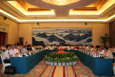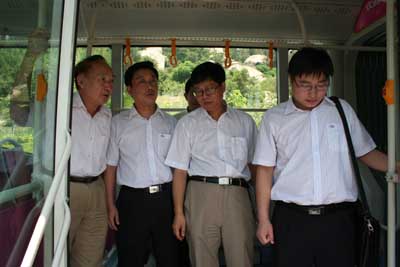 中國(guó)城市公共交通協(xié)會(huì)快速公交委員會(huì)理事長(zhǎng)、建設(shè)部科學(xué)技術(shù)委員會(huì)城市車輛專家委員會(huì)主任 李世豪(右二)、中國(guó)客車標(biāo)準(zhǔn)化委員會(huì)秘書長(zhǎng)王 金銘(左一)和大金龍副總工程師周方明(左二)在一起討論