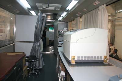 流動(dòng)醫(yī)療車是在歐V客車BJ6120系列豪華城間客車基礎(chǔ)上研發(fā)設(shè)計(jì)的,該車相繼獲得“中國客車最具發(fā)展力產(chǎn)品獎(jiǎng)”、“中國旅游客車金獎(jiǎng)” 、“中國客車節(jié)油獎(jiǎng)”、“中國最佳客車底盤獎(jiǎng)”等諸多大獎(jiǎng),整車具有高性價(jià)比、高可靠性、大功率、低油耗、高安全性的特征。通過三個(gè)月的實(shí)地使用和監(jiān)測(cè),福田歐V醫(yī)療車從車輛性能、設(shè)備配裝、車內(nèi)環(huán)境、使用便捷等方面均受到中醫(yī)藥衛(wèi)生發(fā)展基金會(huì)的認(rèn)可和好評(píng)。每輛車上都配裝了X光機(jī)、超聲機(jī)、全自動(dòng)生化分析儀等必備的先進(jìn)醫(yī)療儀器設(shè)備,相當(dāng)于一座縣級(jí)醫(yī)院擁有的主要設(shè)備,除了大型的手術(shù)以外,體檢、治療、接生均可順利實(shí)施,基本上滿足牧區(qū)人民醫(yī)療保健的需要。