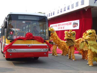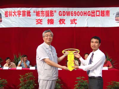 9月18日9:18分,桂林大宇客車有限公司雄獅起舞、鑼鼓喧天,在越南機(jī)械公司黎總經(jīng)理從桂林大宇趙在杓總經(jīng)理手中接過金鑰匙后,15臺“城市靚影”GDW6900HG城市公交車承載著中越友誼緩緩駛出公司大門,奔赴越南。這是桂林大宇繼7月批量出口越南后與該公司的第二次合作。