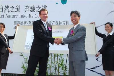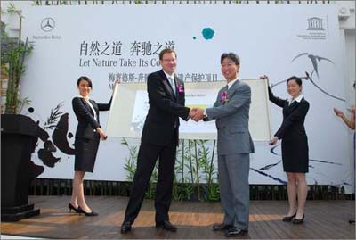 新聞發(fā)布會(huì)上,麥爾斯先生向聯(lián)合國教科文組織北京辦事處代表青島泰之先生交付了首筆100萬元捐款支票,并宣布正式全面啟動(dòng)自然保護(hù)項(xiàng)目。今后,梅賽德斯-奔馳(中國) 有限公司將與聯(lián)合國教科文組織、中國建設(shè)部以及相關(guān)地方政府部門展開長期緊密合作,在首個(gè)接受捐贈(zèng)的四川大熊貓棲息地進(jìn)行一系列的自然保護(hù)活動(dòng)。其余200萬捐款在今后兩年中,將用于中國其它重要自然景觀的保護(hù)。