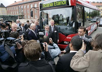 日前,巴西總統(tǒng)盧拉•達席爾瓦在對瑞典進行國事訪問時宣布,巴西圣保羅是全球斯堪尼亞乙醇燃料巴士在公共交通系統(tǒng)試運行的幾個城市之一,第一輛乙醇巴士將于今年十月投入運行。訪問期間,盧拉•達席爾瓦總統(tǒng)與瑞典國王卡爾十六世古斯塔夫、斯堪尼亞首席執(zhí)行官雷夫•奧斯汀一起試乘了斯堪尼亞乙醇巴士。