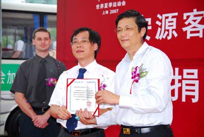 2007上海特奧中心主任向安源客車頒發(fā)捐贈證書,蘇總代表安源客車領(lǐng)取了象征愛心與榮譽的證書