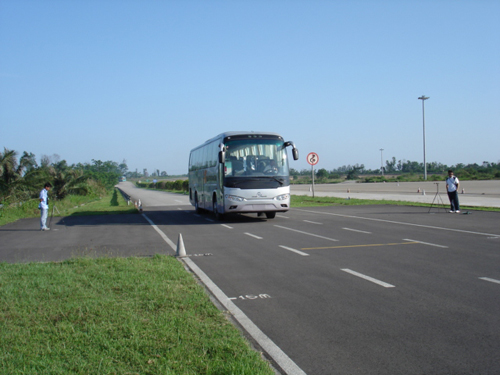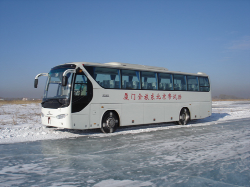 2007年2月份,在一年中最冷的時(shí)候,XML6127客車遠(yuǎn)赴齊齊哈爾,在零下20℃的方圓數(shù)十平方公里的冰雪場地上進(jìn)行了ABS、暖風(fēng)、除霜、除霧等一系列高寒試驗(yàn)。XML 6127車型配置的幾家ABS產(chǎn)品現(xiàn)場試驗(yàn)都表現(xiàn)出了良好的性能。整車方向性較好,不跑偏,制動(dòng)時(shí)震動(dòng)柔和;起步、加速時(shí)ASR工作良好,可平穩(wěn)起步、加速;在70km/h對(duì)開試驗(yàn)時(shí),沒有跑偏、甩尾現(xiàn)象,輪胎沒有明顯拖痕;車速5km/h時(shí)ABS仍然工作。除霜、除霧試驗(yàn)中除霜、除霧的時(shí)間遠(yuǎn)小于國家標(biāo)準(zhǔn)的要求。