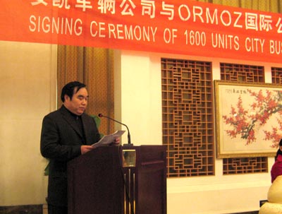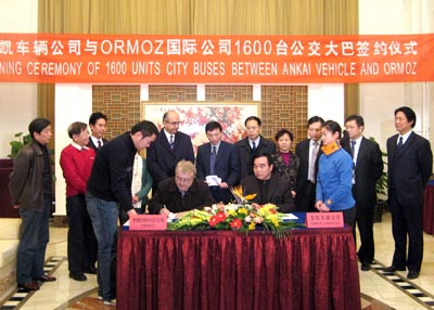 元月7日下午,安凱車輛制造有限公司與伊朗ORMOZ國際貿(mào)易公司達(dá)成出口1600臺(tái)城市客車的協(xié)議,并在合肥明珠大酒店順利舉行了簽約儀式。安凱車輛公司總裁張寬發(fā)與伊朗ORMOZ國際貿(mào)易公司董事長D.J先生分別代表雙方簽署協(xié)議,協(xié)議就安凱車輛公司向伊朗出口1600臺(tái)12米公交大巴以及指定ORMOZ國際貿(mào)易公司作為安凱車輛公司在伊朗代理銷售協(xié)議單位事宜達(dá)成一致。