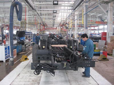 此次新建底盤裝配線是目前國內(nèi)技術(shù)設(shè)備最先進、生產(chǎn)效率最高的客車底盤裝配線,它在提高生產(chǎn)效率、保證產(chǎn)品質(zhì)量、優(yōu)化工作環(huán)境三方面有了顯著提升,并采用了多項先進工藝。一是實現(xiàn)了輸送自動化。新建底盤裝配線中,大的工件,如前后懸架、發(fā)動機總成、輪胎全部采用空中輸送,可大幅提高物流輸送效率。同時,裝配線還設(shè)置了8條板鏈輸送線,生產(chǎn)用工藝小車隨鏈在地下軌道自動返回,完全采用節(jié)拍化生產(chǎn)。生產(chǎn)線起停設(shè)有信號燈或鈴聲提醒,工位設(shè)置起動、急停按鈕,保證安全生產(chǎn)的同時實現(xiàn)了柔性化生產(chǎn)。二是實現(xiàn)了裝配自動化。底盤關(guān)鍵部件,如輪胎、前后橋、離合器等,均采用了機械手裝配和智能化緊固設(shè)備,可有效保證關(guān)鍵部件的裝配質(zhì)量和效率。三是實現(xiàn)了環(huán)境優(yōu)化。裝配線采用了集中加注工藝(底盤防凍液、柴油、柴機油、齒輪油、轉(zhuǎn)向油等采用集中罐體供應,分點定量加注),設(shè)置了尾氣收集系統(tǒng)(底盤發(fā)動工位設(shè)置隨車尾氣收集系統(tǒng)),進一步改善了員工工作環(huán)境。同時,生產(chǎn)現(xiàn)場還設(shè)置了電話點,并在關(guān)鍵工位設(shè)置了工業(yè)電腦,為員工工作提供了便利。此外,裝配線還采用了板簧壓裝工藝,即壓裝模擬實車滿載時板簧狀態(tài),提高板簧裝配質(zhì)量。抽真空加注工藝,即轉(zhuǎn)向油、離合器油加注采用管路抽真空處理,提高了轉(zhuǎn)向和離合器系統(tǒng)的裝配質(zhì)量。底盤檢測也采用德國、美國等國際先進設(shè)備,保證了底盤整體裝配質(zhì)量。