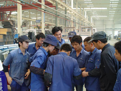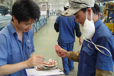 (圖為大金龍焊裝車(chē)間工人上班時(shí)聽(tīng)說(shuō)四川災(zāi)區(qū)人民受災(zāi)情況,紛紛捐款)