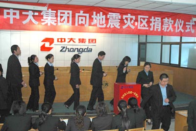 地震發(fā)生后,中大集團(tuán)員工們的心靈感到深深的震撼。 5月14日-5月15日,在鹽城工作的集團(tuán)員工在工余時(shí)間進(jìn)行募捐,他們用淳樸的心和真誠的行動(dòng)表達(dá)著中大人對(duì)災(zāi)區(qū)人民那份真切的牽掛和祝福。本次籌集賑災(zāi)款人民幣102547元。據(jù)悉,5月16日下午,中大集團(tuán)將捐款送交鹽城紅十字會(huì)。