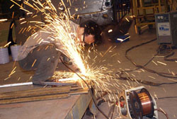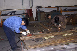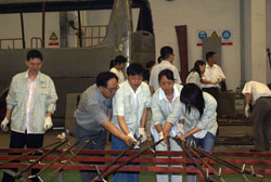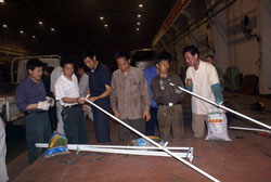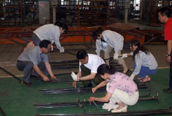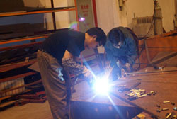 5月21日晚,記者在東風(fēng)旅行車公司見(jiàn)到,整個(gè)焊裝車間燈火通明,焊花飛濺,電弧閃明,一片繁忙的景象,近50余名工人在陣陣刺耳轟鳴聲中切割鋼管、焊接支架。他們正在緊張的為四川汶川地震災(zāi)區(qū)人民趕制帳篷支架。