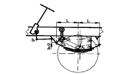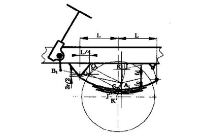 在此結(jié)構(gòu)中, 一方面轉(zhuǎn)向輪依靠板簧導(dǎo)向來保證車輪與車身的相對(duì)運(yùn)動(dòng), 另一方面轉(zhuǎn)向器與轉(zhuǎn)向輪之間的傳動(dòng)機(jī)件也使車輪與車身之間有一定的相對(duì)運(yùn)動(dòng)關(guān)系。這兩種運(yùn)動(dòng)關(guān)系是靠?jī)商转?dú)立的機(jī)構(gòu)來實(shí)現(xiàn)的。況且客車的前懸一般都較長(zhǎng), 很難使其垂臂球銷B1 點(diǎn)在圖3 中的O1 點(diǎn)附近。當(dāng)前輪上下跳動(dòng)時(shí), 轉(zhuǎn)向節(jié)臂球銷中心A1 要沿著彈簧主片中心所決定的軌跡運(yùn)動(dòng)。其運(yùn)動(dòng)軌跡為圓孤JJ ′。另一方面A1 點(diǎn)是縱拉桿上的一點(diǎn), 縱拉桿是繞轉(zhuǎn)向垂臂下端球銷中心B1 點(diǎn)擺動(dòng)。其擺動(dòng)軌跡為圓孤KK′。從簡(jiǎn)圖可看出這兩種運(yùn)動(dòng)不協(xié)調(diào)。這種偏差在輪胎經(jīng)常跳動(dòng)范圍內(nèi)應(yīng)保持在輪胎的彈性范圍內(nèi)。如果偏差過大, 則應(yīng)修改B1 點(diǎn)的位置(A 1 點(diǎn)的位置由前橋生產(chǎn)廠設(shè)計(jì)).