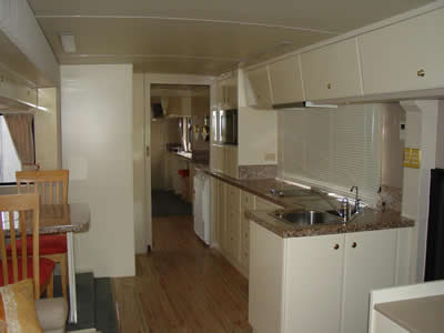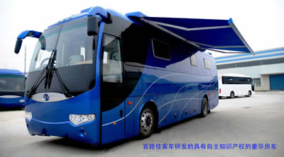 在中外專(zhuān)家的攜手努力下,第一臺(tái)房車(chē)果然不負(fù)眾望。該車(chē)長(zhǎng)10500cm, 寬2460 mm,高3440 mm,是集廚衛(wèi)、臥室、商務(wù)、休閑與一體的綜合式房車(chē),沙發(fā)床、休閑辦公桌、壁櫥等家具一應(yīng)俱全,電視、冰箱、洗衣機(jī)、音響、DVD等電器樣樣俱全。臥室和客廳采用國(guó)際領(lǐng)先的車(chē)身擴(kuò)展技術(shù),在車(chē)子停靠后,可以側(cè)伸出1米,大大增加了車(chē)內(nèi)的空間。同時(shí),該車(chē)還采用了國(guó)際領(lǐng)先的車(chē)身平衡系統(tǒng),無(wú)論車(chē)子?吭谑裁礃拥穆访,車(chē)內(nèi)都可以保持平衡。此外,車(chē)內(nèi)還配備了衛(wèi)星導(dǎo)航和接受系統(tǒng)、車(chē)載移動(dòng)電話、車(chē)載充電系統(tǒng)等,處處散發(fā)出科技的魅力。