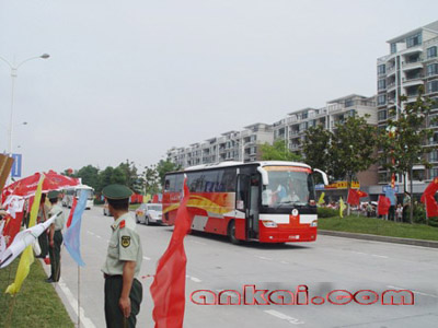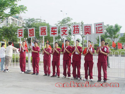 9:20分,奧運圣火來到了政務(wù)廣場,這是我們期待已久的。火炬手手持“祥云”圣火向我們和路旁的群眾招手示意,大家情緒高漲,高喊“中國加油”、“奧運加油”、“安凱加油”的口號,并打出了“安凱客車支持奧運”的標(biāo)語;鹁媸峙芡暝摱温烦毯螅c另外一名火炬手進行火炬接力,隨即他登上了安凱客車與其它火炬手匯合。在火炬?zhèn)鬟f期間,有近6輛安凱客車從我們面前駛過,安凱客車滿載奧運火炬手,承擔(dān)起護送和保護奧運火炬手安全的的光榮使命。在滿載著奧運火炬手的安凱客車后面,還跟著兩輛安凱公司制造的“特警車”,里面滿載武警人員,應(yīng)對隨時發(fā)生的問題。這讓在場的每一個安凱人都感到由衷的自豪,他們都激動的吶喊著:“快看,安凱客車,那是我們的客車!”