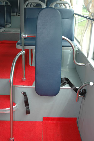 為了方便老弱病殘乘車,中大YCK6126HC城市客車上安排了愛心專座,并以酒紅色的座椅與普通座椅加以區(qū)分。普通的城市客車,沒有座椅的乘客通常是站在兩排座椅的中間過道中,而YCK6126HC卻有著專門的站客區(qū),該車前車廂的左側(cè)并未安裝座椅,騰出寬余的空間給站著的乘客。在乘客區(qū)還有一個(gè)小小的靠墊,特別暖人心,讓站著的乘客可以稍稍舒緩一下疲勞。