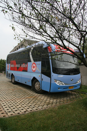 6月7日,從王春才老人家出來后,記者驅(qū)車前往彭州市,經(jīng)過一個多小時的行程,在彭州市紅十字會見到了在此等候的會長丁愛萍女士,在她的帶領(lǐng)下,記者見到了中大客車贈給彭州市的采血用大客車。據(jù)丁會長介紹,地震發(fā)生后,當?shù)丶t十字會已經(jīng)用這款“救命車”舉辦了多次公益獻血活動。