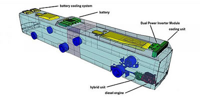 新型混合動力系統(tǒng)繼續(xù)采用艾里遜變速箱公司提供的EP系統(tǒng)。在2 * 75萬 kW時,電動機提供與第一代混合動力客車相同的動力能源。不過 ,新型客車進一步優(yōu)化了匹配性,加強柴油機的動力性。跟第一代客車一樣的是,從制動系統(tǒng)轉(zhuǎn)化的能源同樣存儲于頂部裝置的金屬氫化物鎳 電池。第二代混合動力客車采用標準的柴油車后置發(fā)動機形式,發(fā)動機垂直安置,只是混合動力單元替代了傳統(tǒng)的自動變速箱,動力通過后橋傳輸。