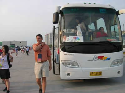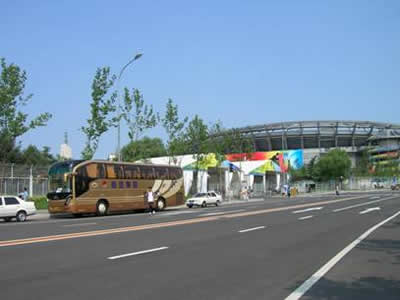 承擔(dān)中國傳媒大學(xué)到首都體育館間的奧運(yùn)志愿者接送工作的金旅客車