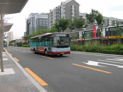 行駛在奧運(yùn)村公交專線的金旅公交車
