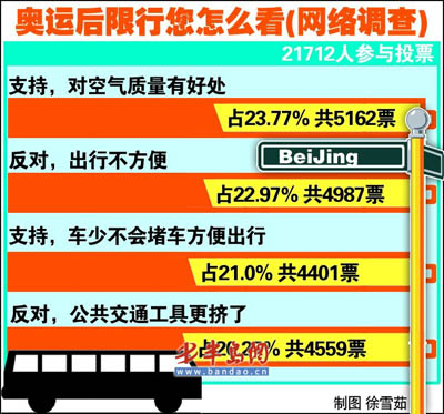 關(guān)于限行措施該不該繼續(xù)執(zhí)行的問題,在網(wǎng)上引起了熱議,正方認(rèn)為:從奧運(yùn)限行期間效果來看,奧運(yùn)限行對改善北京的空氣質(zhì)量和交通擁擠都有很大的效果,支持奧運(yùn)會(huì)后長期限行;而反方則認(rèn)為限行對已經(jīng)買了車的人來說太不方便,如果政府有這方面的打算,就應(yīng)該早出臺(tái)政策,或者有其他相關(guān)政策考慮到有車族。