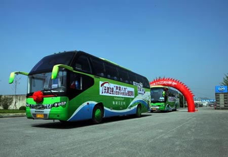今年是建國60周年,天津衛(wèi)視策劃了一檔大型音樂電視活動——《聲震八方》,此次活動將歷時三個月,在全國12個省會城市、2個革命老區(qū)進行巡演。黃?蛙囂峁┝薉D6129K02、DD6119K01兩輛豪華旅游大巴的使用權,做為其活動的指定用車,全程參與電視節(jié)目的明星接待、外景拍攝、背景布置和主題巡游活動。
