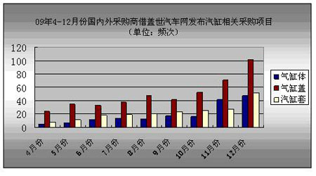 據(jù)CATARC統(tǒng)計顯示,中國汽車發(fā)動機氣缸體的生產(chǎn)規(guī)模在2007年為68.6萬個,比2006年減少了73.6%,主要原因在于各汽車制造商加快了自產(chǎn)氣缸體、氣缸蓋等發(fā)動機主要零部件的步伐。然而,從2009年4月-12月份,國內(nèi)外采購商通過蓋世汽車網(wǎng)平臺采購氣缸體、氣缸蓋及汽缸套的情況來看,其采購頻次并未明顯減少,而是總體上呈現(xiàn)出上升的趨勢。12月份,國內(nèi)外采購商借蓋世汽車網(wǎng)平臺采購汽缸套項目達(dá)102頻次,比4月份的增長了近5倍。由于氣缸蓋易損壞、售后市場需求量大等特性,氣缸蓋的采購量遠(yuǎn)遠(yuǎn)超過氣缸體和汽缸套。