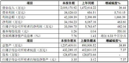 快報顯示,2009年公司實現(xiàn)營業(yè)收入200.92億元,同比增長36.44%;實現(xiàn)歸屬于母公司所有者的凈利潤3.35億元,同比增長482.04%;實現(xiàn)每股收益0.26元,同比增長550%。