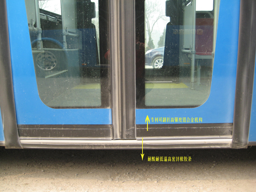 “童氏”內(nèi)擺門技術(shù)與傳統(tǒng)公交車內(nèi)擺門相比,其主要特點是:當乘客門開啟時,圖一中鋁合金部分上面朝里,下面朝外翻轉(zhuǎn);當乘客門關(guān)閉時,鋁合金部分就恢復(fù)成圖片中的垂直狀態(tài),由于鋁合金下方的橡膠壓條很少,因而壓條的變形及移位也很小,隨著門的閉合,懸轉(zhuǎn)復(fù)位的鋁合金機構(gòu)及橡膠條類似小鐵鍬及時清除乘客上車鞋上掉落在踏步處的雨雪或薄冰。此外,由于橡膠條較小,因而使用壽命也相對長些,即使橡膠條掉了,乘客門下的間隙也比現(xiàn)在的結(jié)構(gòu)要小得多。由于鋁合金機構(gòu)有進口彈簧件,鋁型材規(guī)格及材料特殊,愛威公司本著服務(wù)社會、實惠百姓的原則,已經(jīng)把增加的成本控制在800元以內(nèi)。