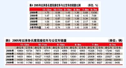 (3)9~10m車(chē)銷(xiāo)量相對(duì)2008年有增大的趨勢(shì),而在2009年的銷(xiāo)量比例處于第二,高于5年的平均值,高于正常年份的2007年,說(shuō)明在2009年銷(xiāo)量結(jié)構(gòu)中,9~10m客車(chē)有明顯增大的趨勢(shì),是2009年客車(chē)市場(chǎng)中的一個(gè)亮點(diǎn)。