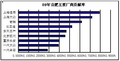 合肥市場(chǎng)09年車市增長(zhǎng)顯著,各汽車廠商在合肥市場(chǎng)都有所斬獲,下面列出主要廠商在合肥銷售量占全國(guó)銷售的貢獻(xiàn)率情況,可以發(fā)現(xiàn)合肥對(duì)于上海通用廠商、上海大眾廠商、奇瑞廠商與比亞迪是比較重要的市場(chǎng)。