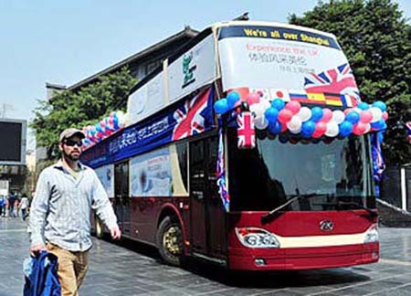 3月18日,由英國(guó)Big Bus公司和安徽安凱汽車股份有限公司合資生產(chǎn)的上海世博會(huì)英國(guó)世博雙層巴士亮相成都寬窄巷子,引得市民頻頻按動(dòng)快門拍照。