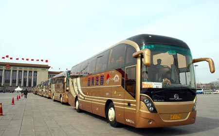 “我們從1998年起就開始服務(wù)全國兩會,而且參與服務(wù)的車輛逐年增長。今年,我們一共有84輛車參與服務(wù),其中包括兩個新車型XML6700現(xiàn)代底盤考斯特20輛與XML6897車型4輛,加上國產(chǎn)底盤考斯特37輛、XML6125‘開拓者’20輛和XML6127‘金鳳凰’3輛!睆B門金旅華北地區(qū)服務(wù)經(jīng)理田其林向記者介紹道。