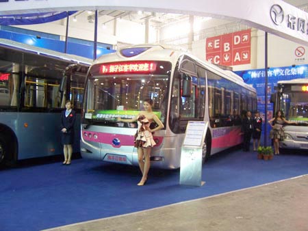 車模正在展示公司最近推出的新能源城市客車——精典WG6120HAA4型城市客車