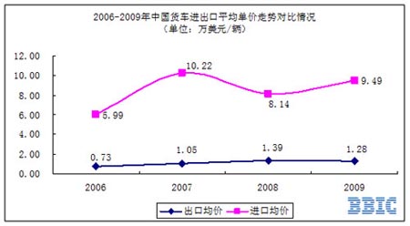 圖表2:2006-2009年中國貨車進出口平均單價走勢對比情況