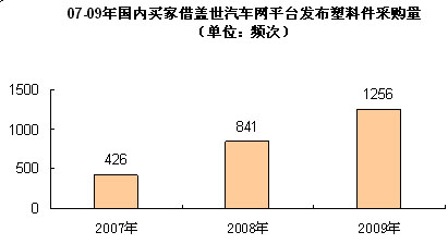 近幾年來,汽車用塑料的最大品種--聚丙烯,每年以2.2%~2.8%的速度快速增長。而且隨著中國汽車產(chǎn)量的不斷提升,汽車塑料件產(chǎn)業(yè)也得到快速發(fā)展。2009年,隨著國內(nèi)汽車產(chǎn)量突破1300萬輛的規(guī)模,國內(nèi)車企對(duì)塑料件的需求量明顯提升,國內(nèi)買家09年借蓋世汽車網(wǎng)平臺(tái)發(fā)布塑料件采購項(xiàng)目達(dá)1256頻次,相比2007年的426頻次實(shí)現(xiàn)了近200%的增長。