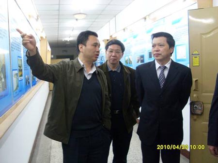 總經(jīng)理解國(guó)林(右一)在理工大學(xué)副校長(zhǎng)石曉輝(左一)的帶領(lǐng)下參觀汽車(chē)工程學(xué)院