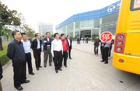 恒通獨(dú)立董事楊茂超(中)、總經(jīng)理唐乾棟(左三)陪同國家公安部交管總局副局長王金彪(左一)、交管總局秩序處副處長李哲(右二)、市交巡警總隊(duì)總隊(duì)長錢永培(右三)、副總隊(duì)長陳芃(左二)、市公交集團(tuán)副總經(jīng)理向勇(右一)一行參觀恒通加強(qiáng)型安全校車