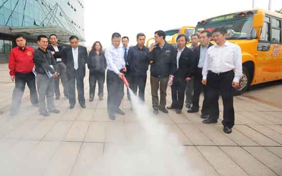 領(lǐng)導(dǎo)們觀看恒通安全校車破玻試驗(yàn)及便攜式滅火器演示