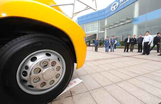 領(lǐng)導(dǎo)們觀看恒通安全校車輪胎防扎防漏試驗(yàn)