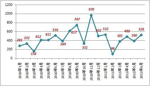 2010-2011年6月遼寧省大中型客車月度銷量走勢