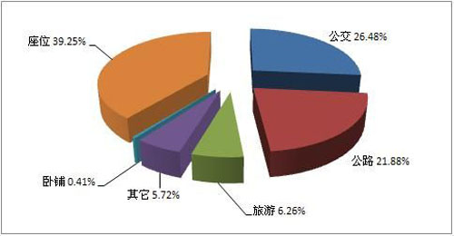 座位客車與公交客車占有遼寧大中型客車市場的絕大部分比例,分別占市場的39.25%和26.48%,其中座位比例最高,表明遼寧省公路交通運輸業(yè)比較發(fā)達,客流量相對較大,對于公路座位客車的需求也相對較高。