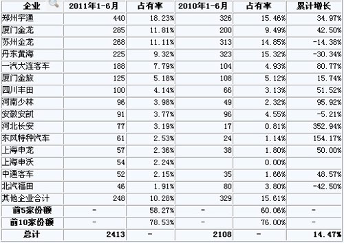 2010 -2011年6月遼寧省大中型客車分企業(yè)銷量情況 單位:輛、%