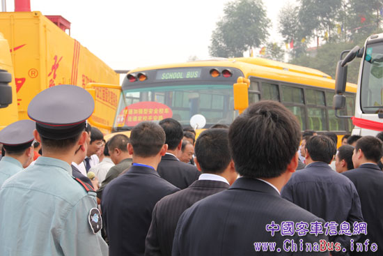 開(kāi)工啟動(dòng)儀式結(jié)束后,重慶市安監(jiān)局局長(zhǎng)肖健康陪同重慶市副市長(zhǎng)童小平、國(guó)家安全監(jiān)管總局規(guī)劃科技司副司長(zhǎng)施衛(wèi)祖等領(lǐng)導(dǎo)及參會(huì)人員參觀恒通加強(qiáng)型安全校車(chē),醒目的顏色、獨(dú)特的造型首先就吸引了大家的目光,隨后,肖局長(zhǎng)對(duì)恒通加強(qiáng)型安全校車(chē)的各項(xiàng)安全指標(biāo)和作用進(jìn)行了詳細(xì)解說(shuō),當(dāng)聽(tīng)到該車(chē)不僅符合《專(zhuān)用小學(xué)生校車(chē)安全技術(shù)條件》的強(qiáng)制性國(guó)家標(biāo)準(zhǔn),而且加入了其他9項(xiàng)軍工級(jí)增強(qiáng)標(biāo)準(zhǔn),童小平市長(zhǎng)、施衛(wèi)祖副司長(zhǎng)等領(lǐng)導(dǎo)進(jìn)行了充分肯定。施衛(wèi)祖副司長(zhǎng)親自登上恒通加強(qiáng)型安全校車(chē),參觀了內(nèi)部布局、安全增強(qiáng)設(shè)計(jì)后,更是連用三個(gè)“不錯(cuò)”,來(lái)形容他對(duì)該車(chē)的印象。另一位參會(huì)領(lǐng)導(dǎo)表示:恒通校車(chē)的安全性很高,是非常成熟的安全產(chǎn)品,應(yīng)該大力推廣。參觀過(guò)程中,恒通加強(qiáng)型校車(chē)猶如一顆耀眼的明星,倍受各領(lǐng)導(dǎo)和參觀者的關(guān)注。