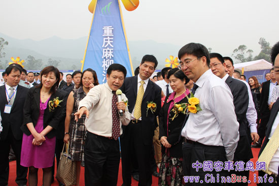 重慶市安監(jiān)局局長(zhǎng)肖健康向重慶市副市長(zhǎng)童小平、國(guó)家安全監(jiān)管總局規(guī)劃科技司副司長(zhǎng)施衛(wèi)祖等參觀人員介紹恒通加強(qiáng)型安全校車(chē)