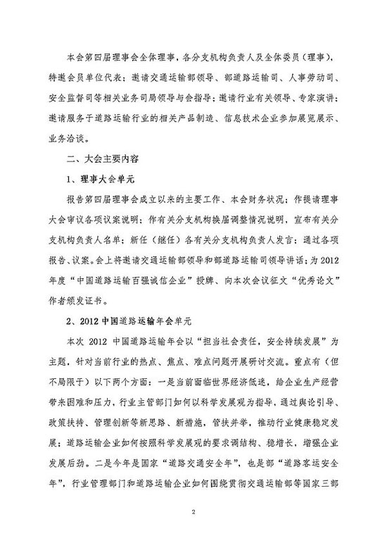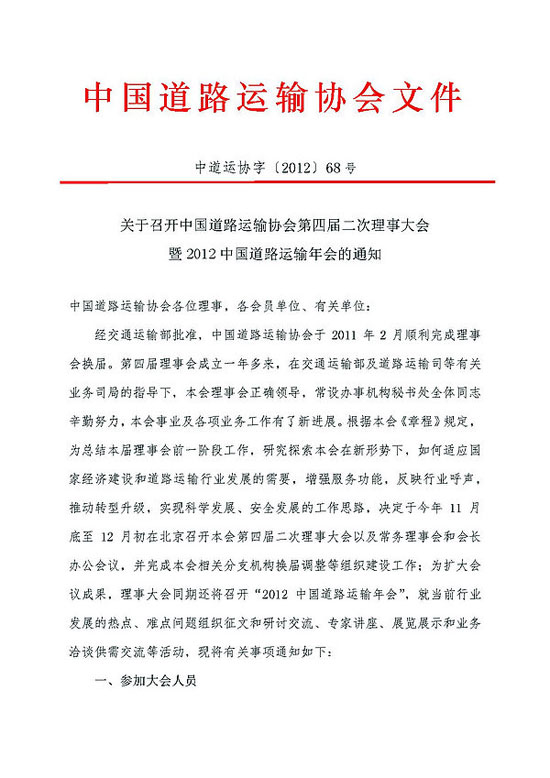 關(guān)于召開(kāi)中國(guó)道路運(yùn)輸協(xié)會(huì)第四屆二次理事大會(huì)暨2012中國(guó)道路運(yùn)輸年會(huì)的通知