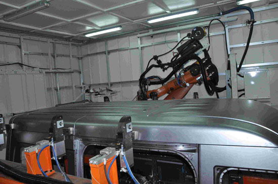 從圖片中可以看出,焊裝生產(chǎn)線自動化程度很高,這個生產(chǎn)線重要關鍵部位均配備德國KUKA焊接機器人。江淮星銳焊裝車間地板線和車身合裝生產(chǎn)線上一共擁有8臺德國庫卡機器人。地板線機器人負責地板與車架關鍵部位的焊接任務,車身合裝線機器人負責地板與車身關鍵部位的焊接任務。雖然庫卡機器人在較新的汽車生產(chǎn)中應用已經(jīng)很廣泛,但是在歐系輕客所在的商用車領域,尤其是一些老牌產(chǎn)品早期的生產(chǎn)車間還是依靠人工。而機器人不僅能夠解放人力,提高工作效率,更重要的是可以實現(xiàn)焊接工藝的高度精準。